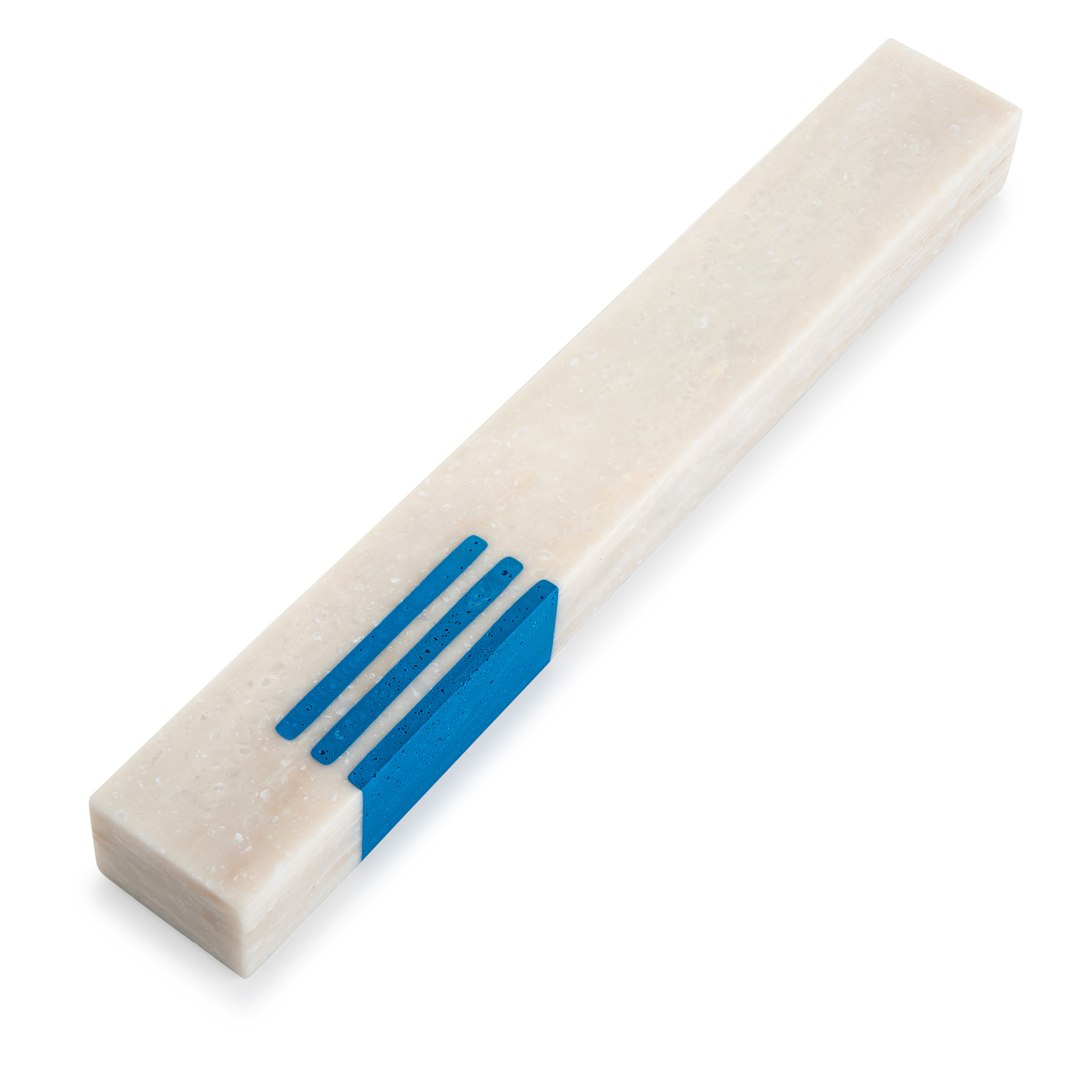 <p dir="rtl"><span><span>מזוזה שקבועה בפתח ביתנו ובכניסה לכל חדר, היא הפריט העיצובי הראשון שמקבל את פנינו. בזכות עיצובה המינימליסטי והלא שגרתי, המשדר נוכחות ומפרש בצורה עכשווית את הסממן היהודי עתיק היומין (שלושה פסים צבעוניים המסמלים את האות ש' של שדי) - המזוזה החדשה מחברת בין עבר, הווה ועתיד.</span></span></p><p dir="rtl"> </p><p dir="rtl"><span><span>מיוצר מקוריאן.</span></span></p><p dir="rtl"><span><span>נעשה בתהליך ייחודי שבו לקחנו פחת של קוריאן וחידשנו אותו</span></span></p><p dir="rtl"><span><span>> צבע: לבן אבן וכחול</span></span></p><p dir="rtl"><span><span>> גימור מבריק<br>> 100% מוצר ירוק</span></span></p><p dir="rtl"><span><span>> תעודה: מוצר ירוק</span></span></p><p dir="rtl"><span><span>> מידות: אורך: 25 ס"מ, רוחב: 3.5 ס"מ, עומק: 2.5 ס"מ</span></span></p><p dir="rtl"><span><span>> המזוזה מגיעה ללא קלף. המזוזה מתאימה לקלף עד 20 ס"מ</span></span></p><p dir="rtl"> </p><p dir="rtl"><span><span>> המוצרים שלנו מגיעים ארוזים ומוגנים</span></span></p><p dir="rtl"><span><span>> הצבעים להמחשה בלבד<br>> עבודת יד מחומר בשם קוריאן אשר פותח לפני 50 שנה כמשטח עבור סביבות עבודה קשות, משווק בעולם מאז שנת 1971 ומיובא לישראל מזה כ – 40 שנה. השימוש העיקרי ב CORIAN : משטחים, כיורים וחיפויי קיר לשימוש מטבח, אמבט ושימושים ביתיים ומוסדיים רבים נוספים.</span></span></p><p dir="rtl"> </p><p dir="rtl"><strong><span><span>איך להדביק את בית המזוזה על משקוף הדלת כך שהאחיזה בו תחזיק מעמד לאורך זמן ?</span></span></strong></p><p dir="rtl"><span><span>במשקופים בגימור גס כדוגמת קיר/טיח עדין: </span></span></p><p dir="rtl"><span><span>יש להחליק את פני השטח עם נייר ליטוש, לנגב עם מטלית לחה את האבק ולבסוף לנגב עם מטלית יבשה. ככל שפני השטח יהיו חלקים, נקיים מאבק או חורים, כך המזוזה תצמד באופן מושלם. </span></span></p><p dir="rtl"><span><span>יש להסיר את כיסוי המגן שעל המדבקה. להיזהר לא לגעת בדבק, אלא לאחוז בצידי המזוזה ולהצמיד למשקוף במיקום הרצוי. יש להפעיל לחץ קל כ-30 שניות עד להיצמדות טובה. </span></span></p><p dir="rtl"><span><span>במשקוף עץ טבעי גס: מומלץ ללטש מעט את פני השטח בעזרת נייר ליטוש ולאחר מכן לנקות מאבק בעזרת מטלית בד/נייר. יש להסיר את כיסוי המגן שעל המדבקה. להיזהר לא לגעת בדבק, אלא לאחוז בצידי המזוזה ולהצמיד למשקוף במיקום הרצוי. יש להפעיל לחץ קל כ-30 שניות עד להיצמדות טובה. </span></span></p><p dir="rtl"><span><span>במשקופים חלקים כדוגמת עץ מצופה לקה/מתכת צבועה/נירוסטה/זכוכית/פורמייקה: </span></span></p><p dir="rtl"><span><span>יש לנקות את פני השטח משומן ואבק באמצעות מטלית לחה ולנגב. רק לאחר שהאזור יבש ניתן להדביק את המזוזה. יש להסיר את כיסוי המגן שעל המדבקה. להיזהר לא לגעת בדבק, אלא לאחוז בצידי המזוזה ולהצמיד למשקוף במיקום הרצוי. יש להפעיל לחץ קל כ-30 שניות עד להיצמדות טובה. </span></span></p><p dir="rtl"><strong><span><span>כללי:</span></span></strong></p><ul dir="rtl"> <li><span><span>מומלץ להכניס את הקלף למזוזה לפני ההדבקה למשקוף.</span></span></li> <li><span><span>יש לשים לב כאשר מחדירים את הקלף לבית המזוזה, שהמילה "שדי" תופנה כלפי מעלה ביחס לכיוון תליית המזוזה. </span></span></li></ul>